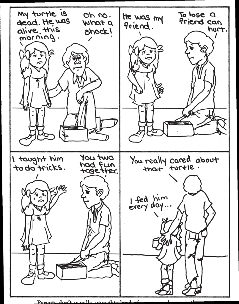 อีกครั้งที่ได้คุยกับคุณลุงคุณป้าที่อเมริกา หนูบอกเค้าว่าเหมือนพระเจ้าพูดถึงความเศร้าโศกเสียใจ (Grief) ลึก ๆ ที่ยังหลงเหลืออยู่ คุณลุงอธิษฐานอวยพรจากหัวใจของพ่อที่แสนดี คำพูดที่เต็มไปด้วยความรักและหวังดีนั้นปลดล็อกหัวใจหนูแบบเขื่อนแตก หนูนั่งซบหน้าร่ำไห้ต่อหน้าพ่อเป็นครั้งแรกกับความทุกข์ เศร้า สับสน จากวินาทีตกใจจนถึงช่วงเวลาที่ต้องปรับตัวหลังผ่านเหตุการณ์เลวร้าย (Aftermath) ของการสูญเสียคนรัก สุดท้ายหนูระเบิดคำหนึ่งออกมาทั้งเสียงสะอื้นจากหัวใจของเด็กคนหนึ่งที่ไม่เคยพูดคำนี้ได้ คำสั้น ๆ คือ “หนูเสียใจ” ที่คนที่หนูรักมากจากไปกระทันหัน
